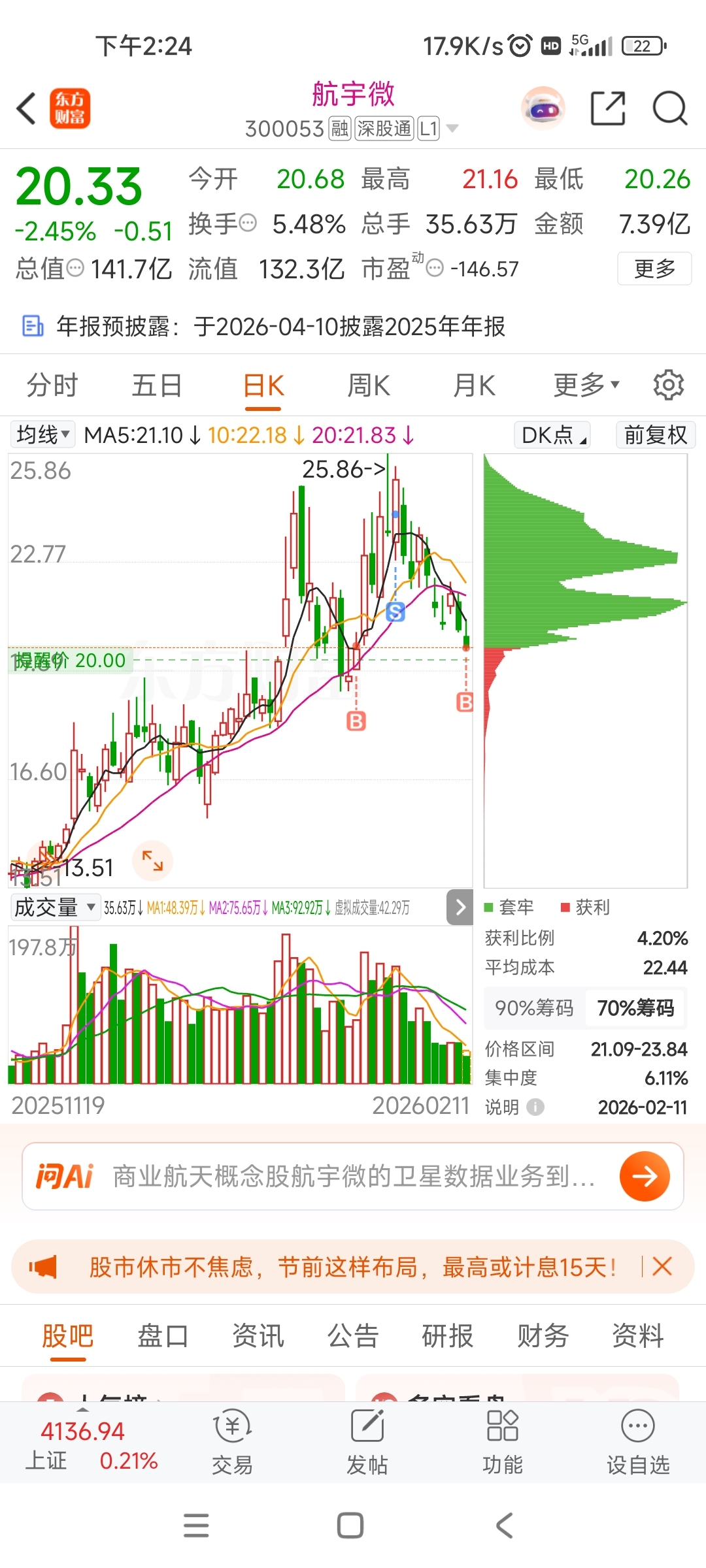 $航宇微(SZ300053)$ 兄弟姐妹们回家陪你们了哈哈一起单调一只股
