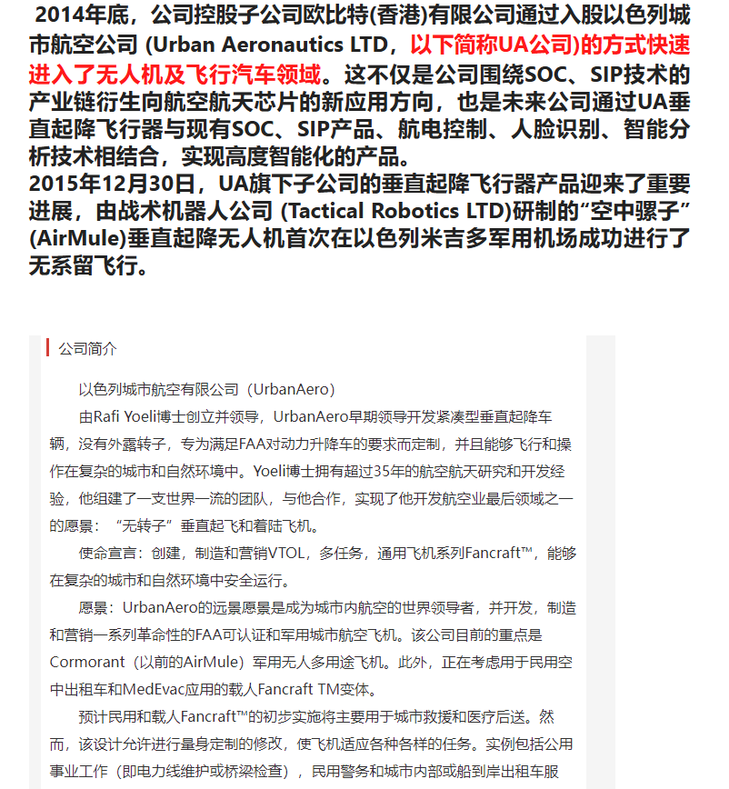 子公司持有以色列 Urban Aeronautics LTD 航空公司