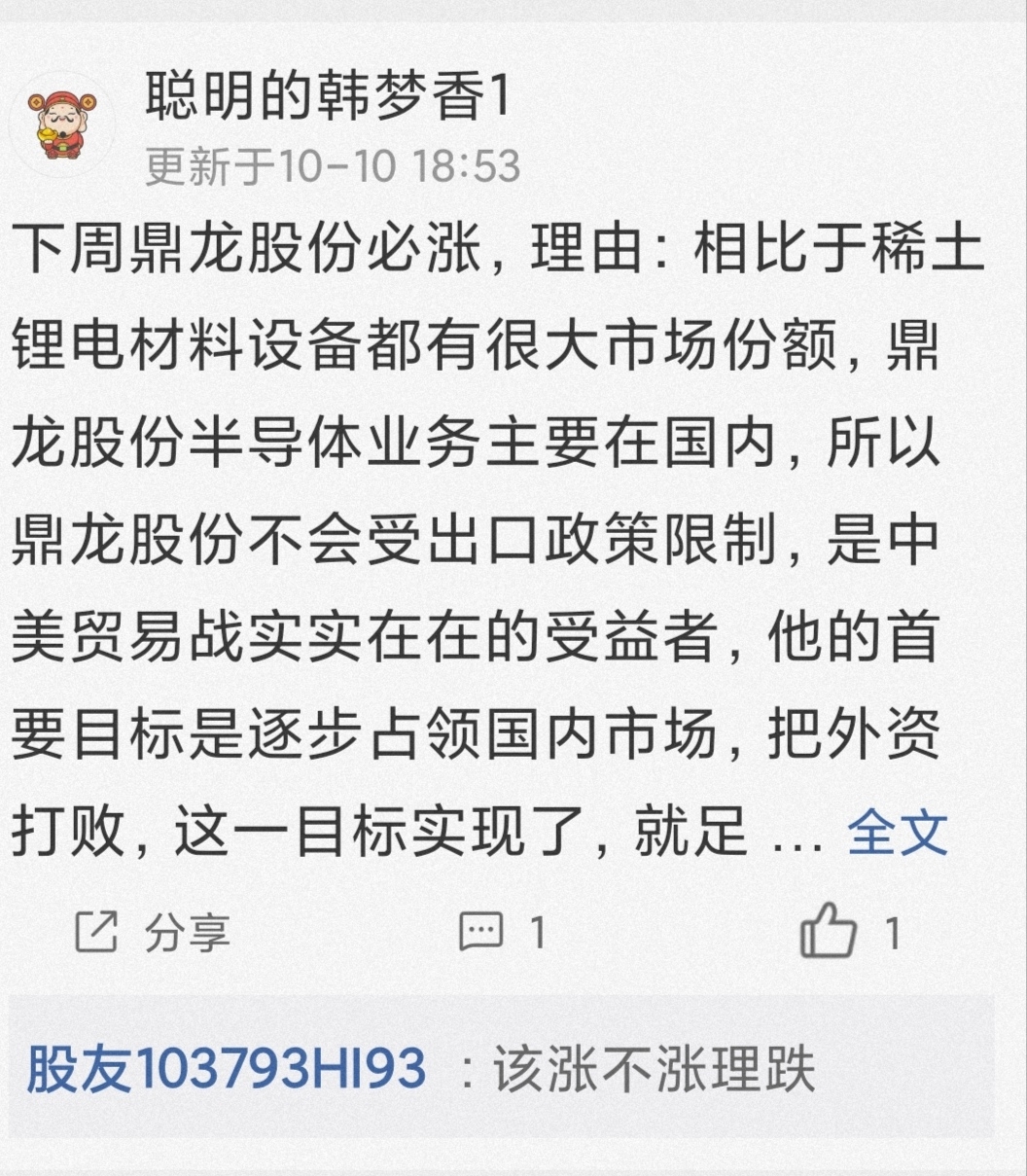 我上周五就说,下周鼎龙股份必涨,现在有截图为证。有谁听劝,买入的出来冒个泡。