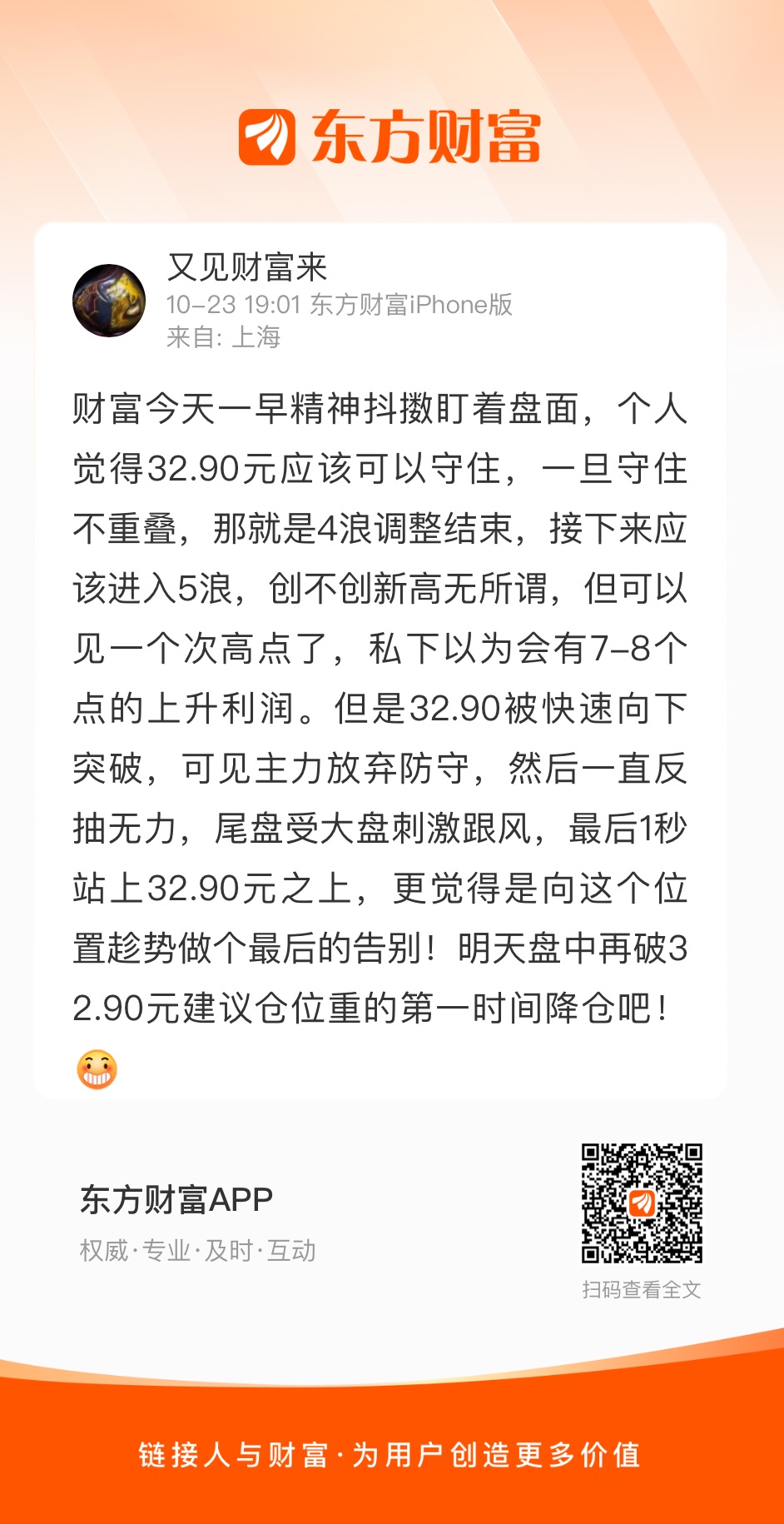 财富今天一早精神抖擞盯着盘面,个人觉得32.90元应该可以守住,一旦守住不重叠,那就是4浪调整结束,接下来应该进入5浪,创不创新高无所谓,但可以见一个次高点了,私下以为会有7-8个点的上升利润。但是32.90被快速向下突破,可见主力放弃防守,然后一直反抽无力,尾盘受大盘刺激跟风,最后1秒站上32.90元之上,更觉得是向这个位置趁势做个最后的告别!明天盘中再破32.90元建议仓位重的第一时间降仓吧!
