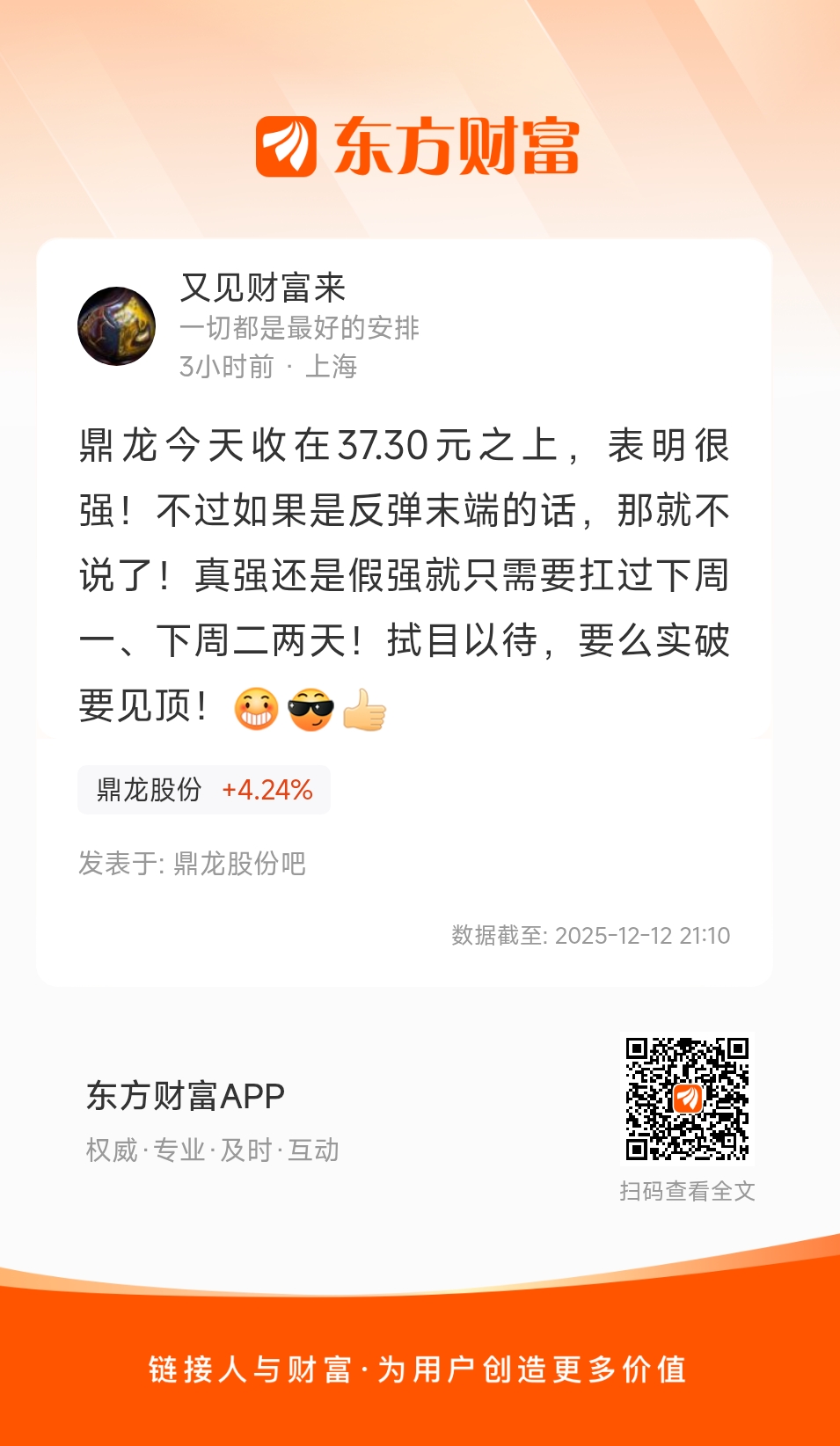鼎龙今天收在37.30元之上,表明很强!不过如果是反弹末端的话,那就不说了!真强还是假强就只需要扛过下周一、下周二两天!拭目以待,要么实破要见顶!