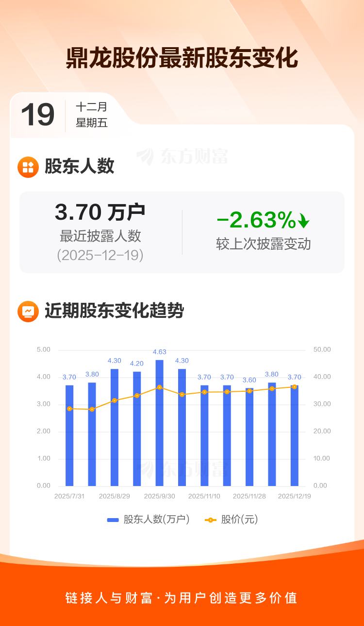 鼎龙股份最新披露数据显示,截至12月19日公司股东户数为3.70万户,较上期(2025年12月10日)减少1000户,降幅为2.63%。户均持有流通股数量由上期的1.94万股上升至1.99万股,户均持股金额由上期的69.30万元增加至72.55万元。