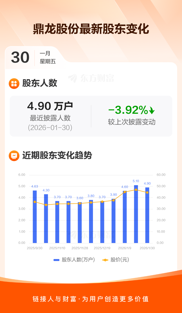 鼎龙股份最新披露数据显示,截至1月30日公司股东户数为4.90万户,较上期(2026年1月20日)减少2000户,降幅为3.92%。户均持有流通股数量由上期的1.45万股上升至1.50万股,户均持股金额由上期的67.91万元减少至66.99万元。