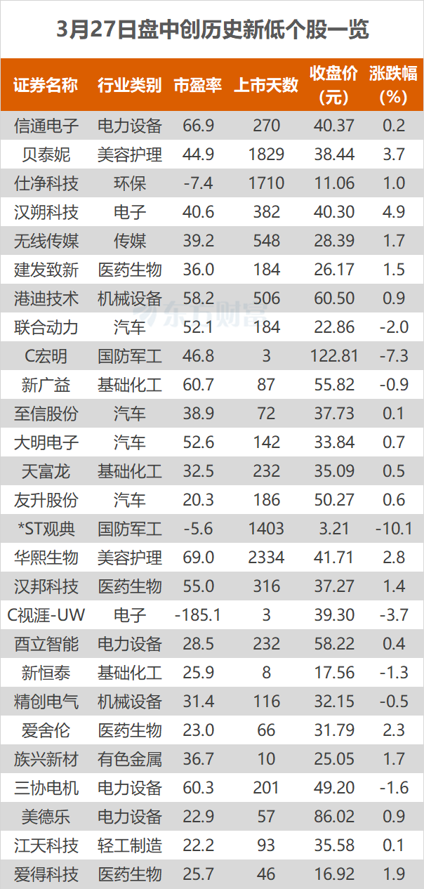 东方财富Choice数据显示,今日有27只个股盘中股价创历史新低。