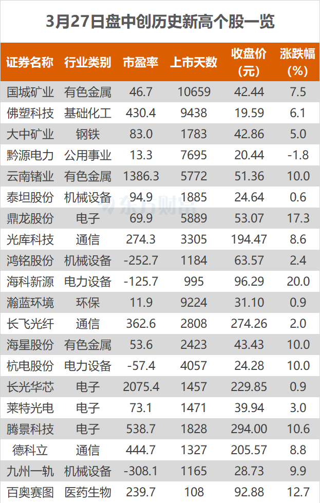 3月27日,A股三大指数今日低开高走,截止收盘,沪指涨0.63%,收报3913.72点;深证成指涨1.13%,收报13760.37点;创业板指涨0.71%,收报3295.88点。东方财富Choice数据显示,今日有20只个股盘中股价创历史新高,分别为鼎龙股份、长飞光纤等。