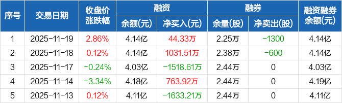融资方面,当日融资买入3818.52万元,融资偿还3774.19万元,融资净买入44.33万元。融券方面,融券卖出600股,融券偿还1900股,融券余量2.25万股,融券余额19.42万元。融资融券余额合计4.14亿元。