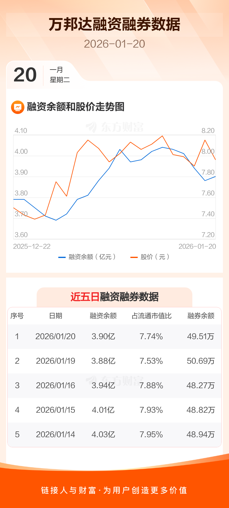 交易所最新数据显示,万邦达于2026年1月20日获融资买入1114.85万元,融资偿还970.03万元,当日融资净买入144.82万元。目前,该股融资余额3.90亿,占流通市值比例为7.74%。
