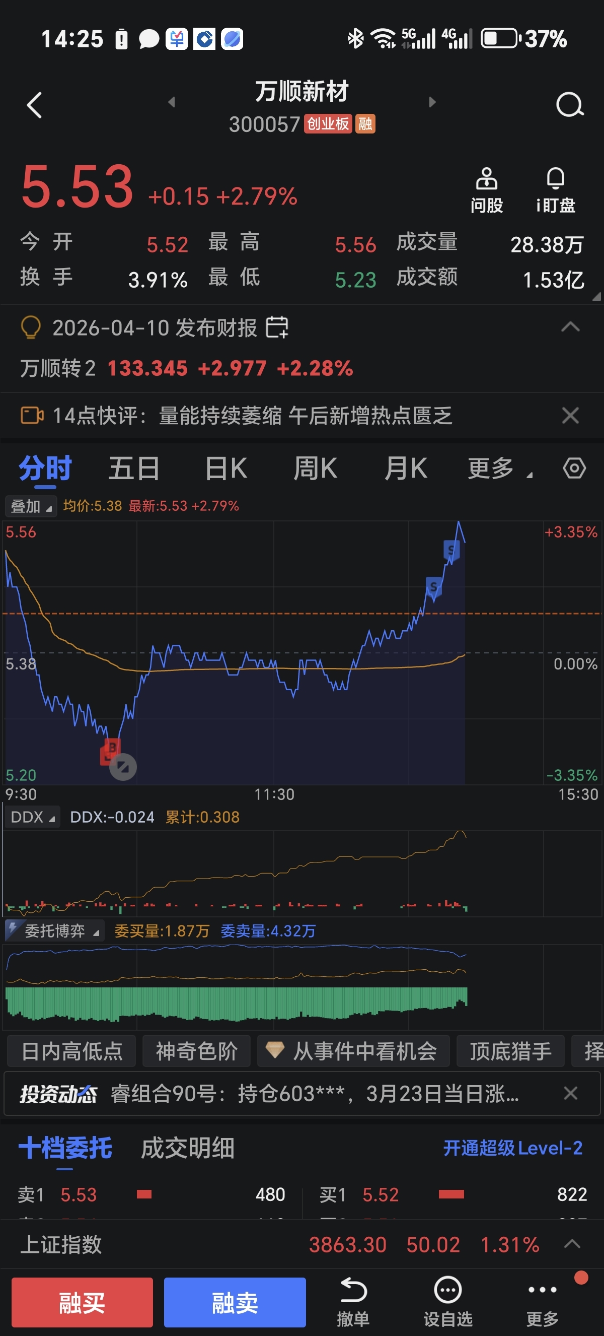 $万顺新材(SZ300057)$ 谢谢老毒,今天操作完成,不贪,5个点