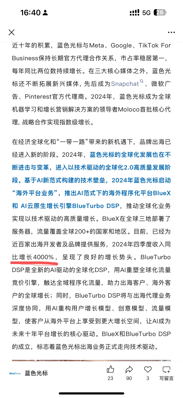 $蓝色光标(SZ300058)$ 这个公司的宣传员是不是发错内容了?这4000%是营收还是利润?如果是假的那么要不要负责法律责任?#收盘点评#