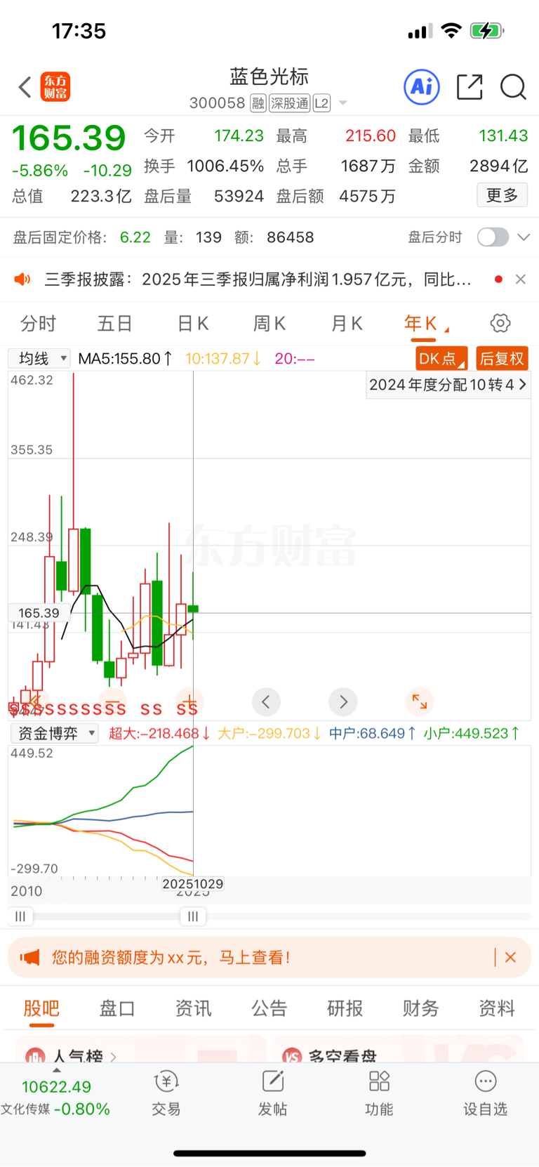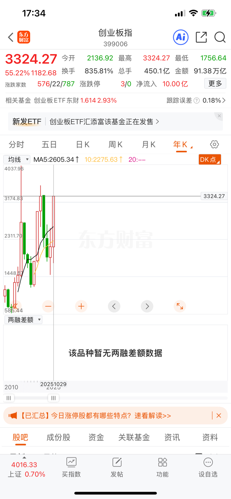 蓝色光标A股异类。业绩增长,年线确跌幅近10%,而创业板指数涨幅年线55%。