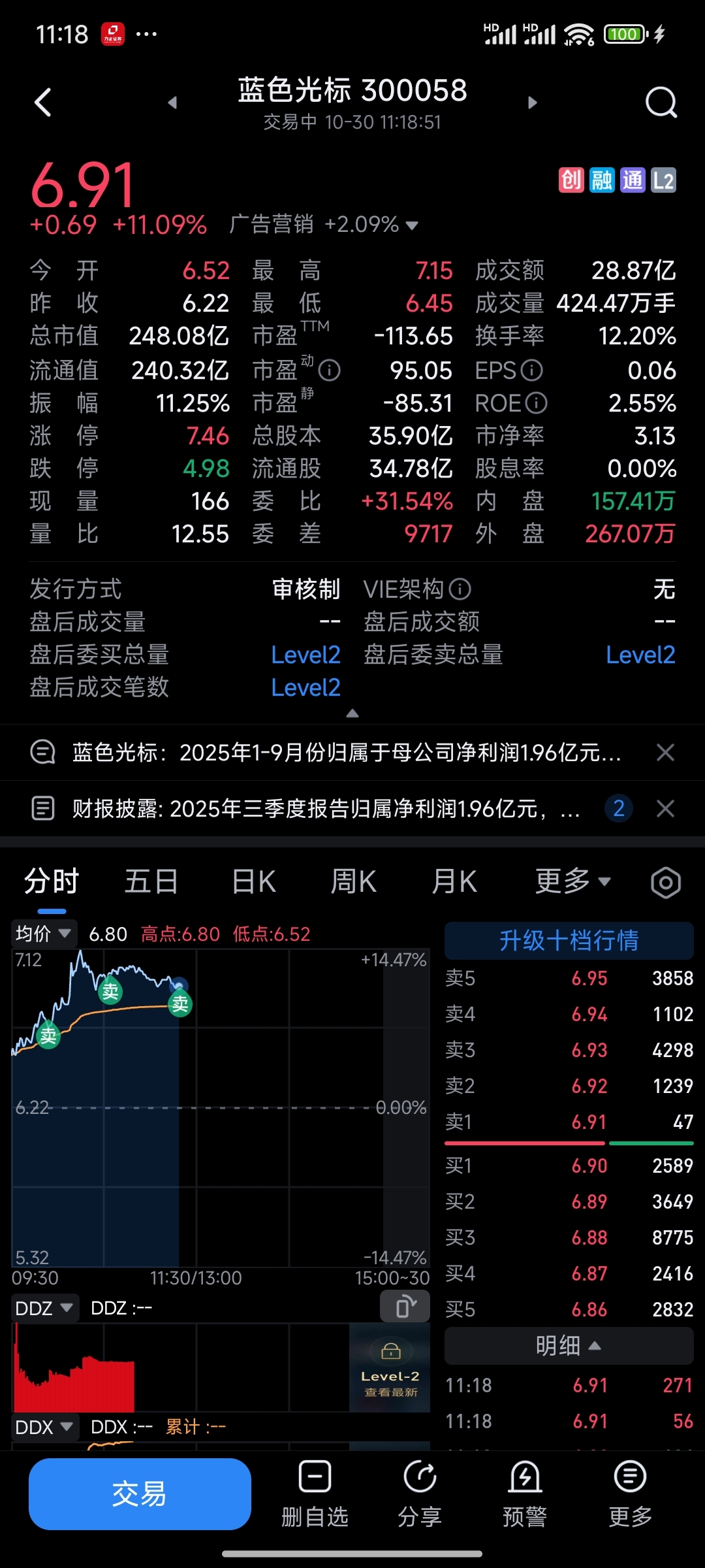 $蓝色光标(SZ300058)$ 走了,不封板,力道不够