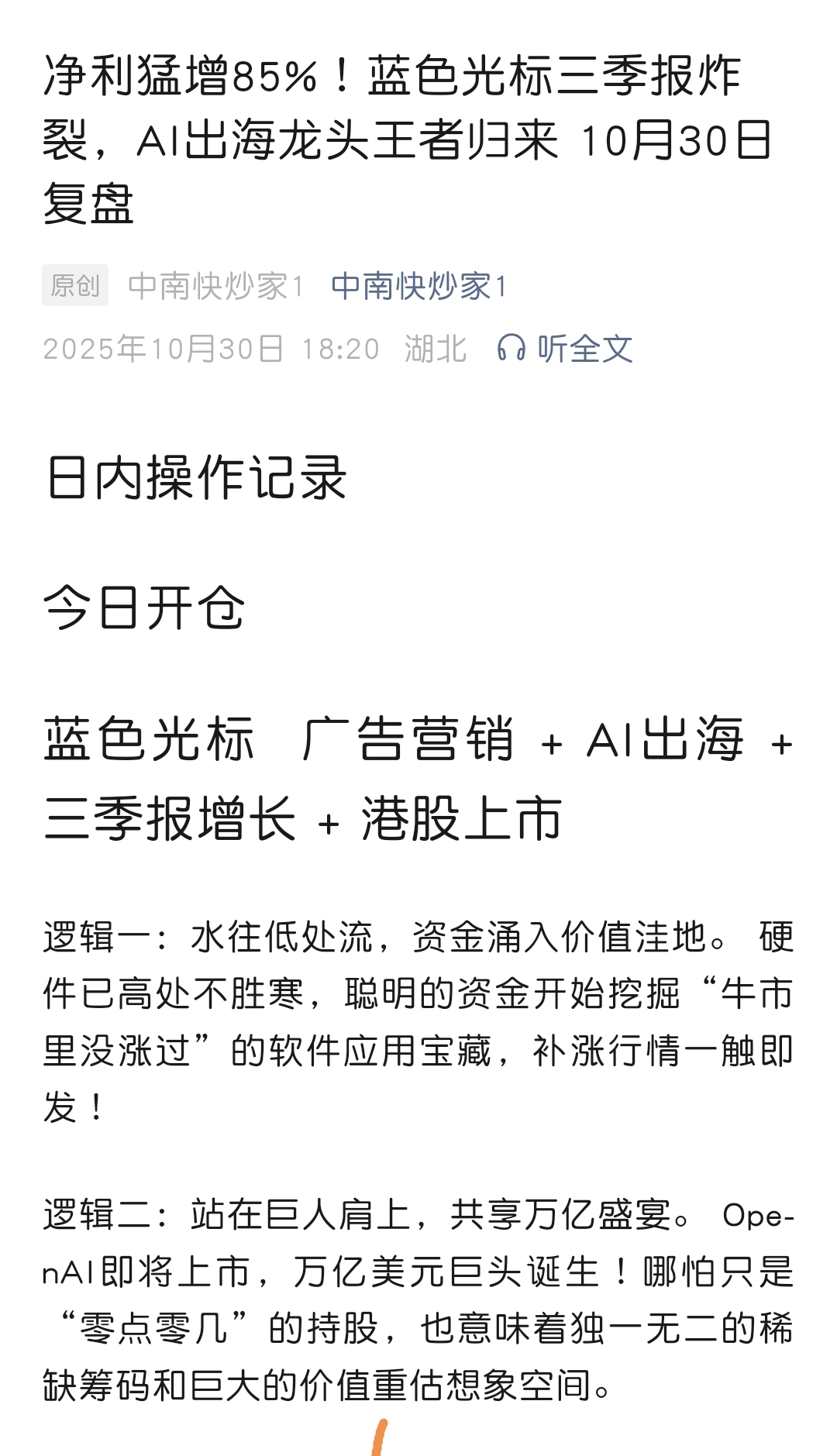 $蓝色光标(SZ300058)$ 广告营销 + AI出海 + 三季报增长 + 港股上市