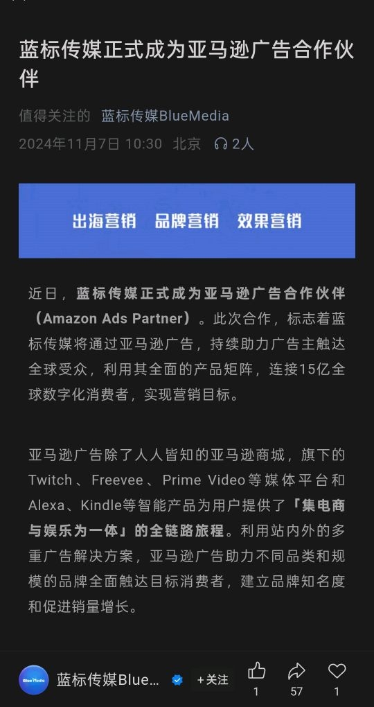 $蓝色光标(SZ300058)$ 蓝标传媒正式成为亚马逊广告合作伙伴$亚马逊(NASDAQ|AMZN)$