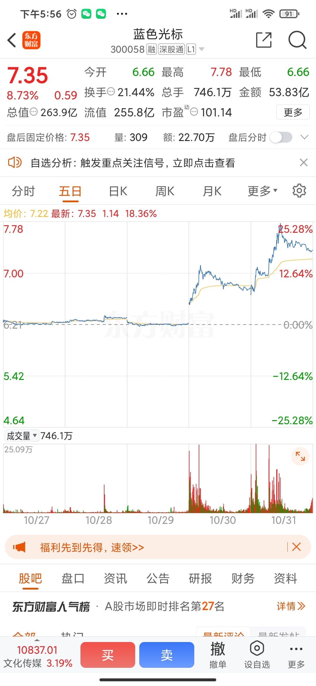 $蓝色光标(SZ300058)$ 周一出手慢的人只能去追高