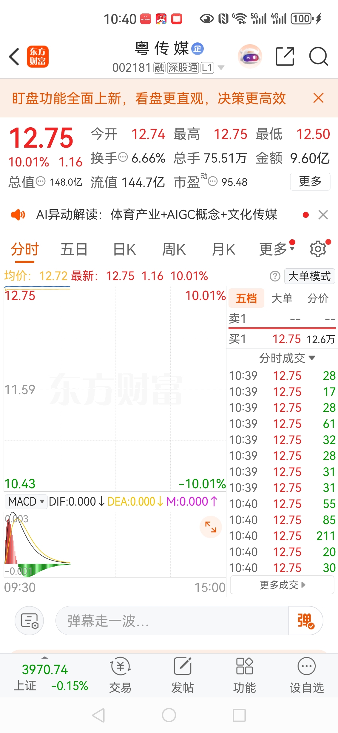 同是传媒广告公司,你兄弟粤传媒又涨停板了,蓝色光标,我看好你最靓的仔,加仓500