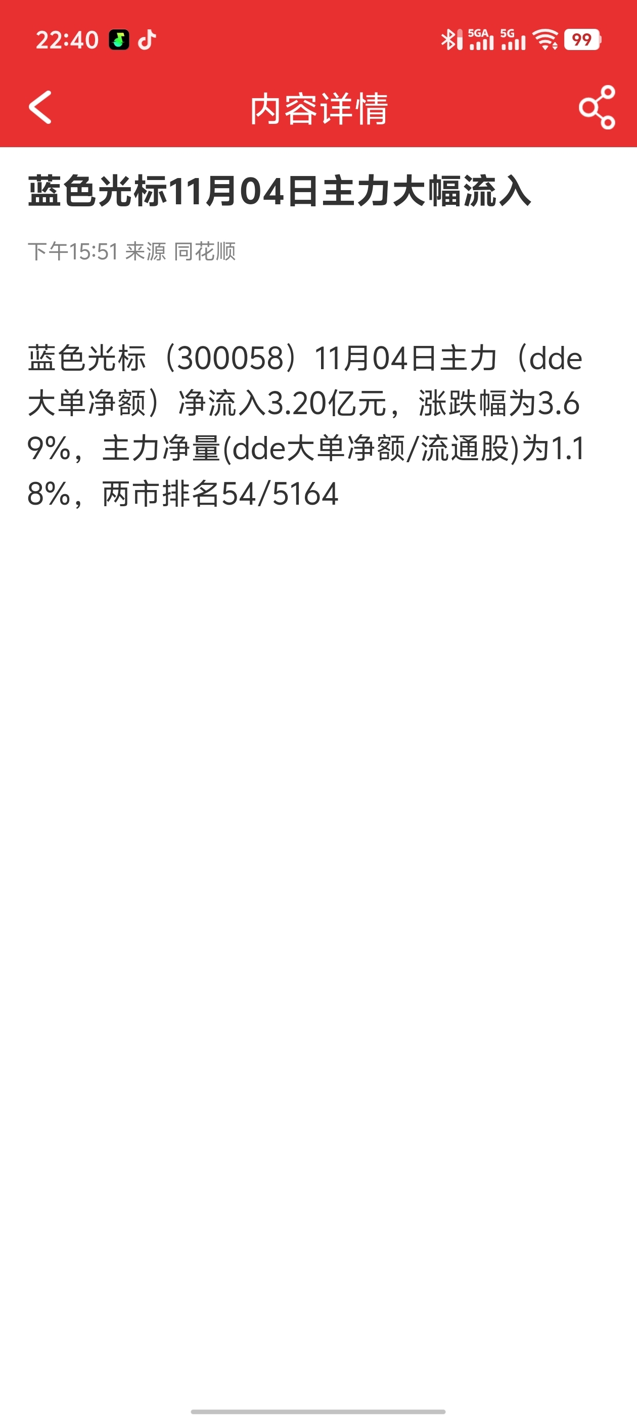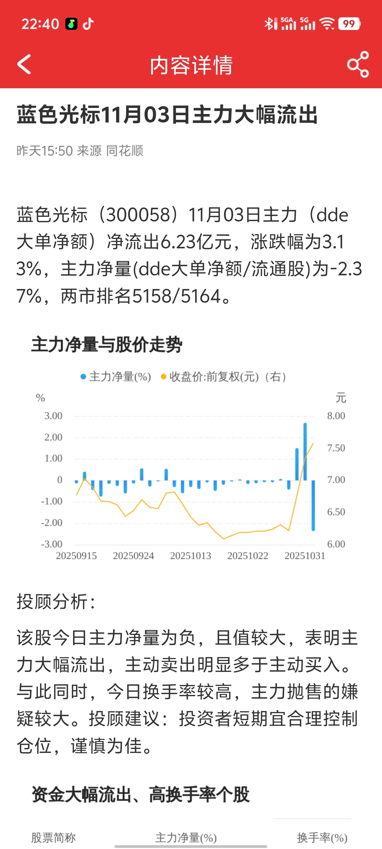 $蓝色光标(SZ300058)$ 3日流出6.3亿,4日流入3.2亿,主力就是对中资金了,大家自由考虑考虑,是不是,流出多流入少,就是在诱,明天大概率高开低走,然后主力在流出少,流入多。对冲一下。杀小散户,今晚美股下杀黄