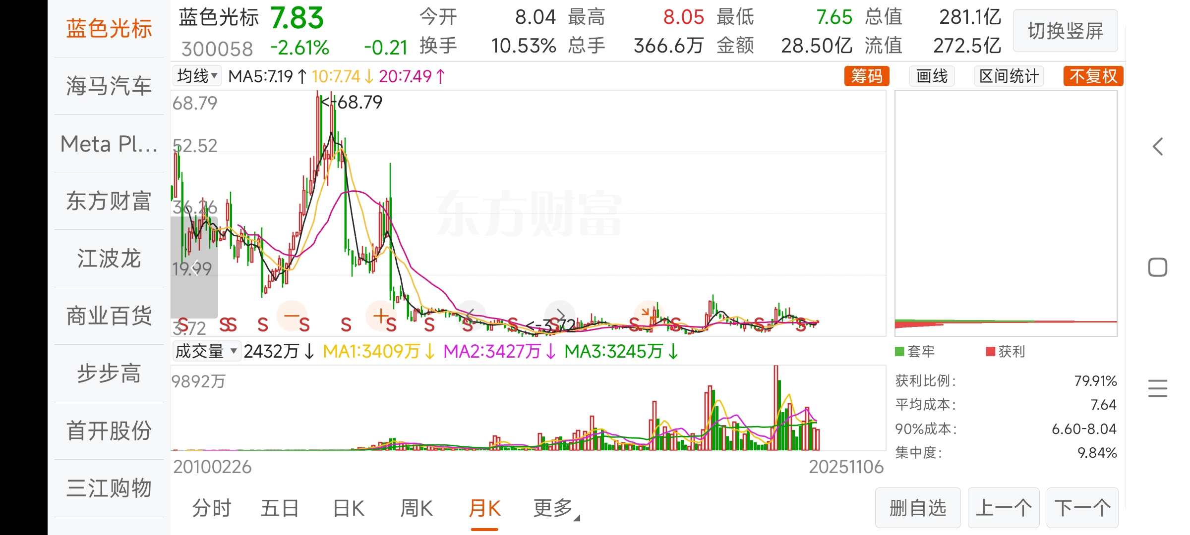 $蓝色光标(SZ300058)$ 这月线贴吧还一大群人钓毛说是高位,兄弟大盘都4000点了,十年新高了。。基本上很难找到这样的股票了