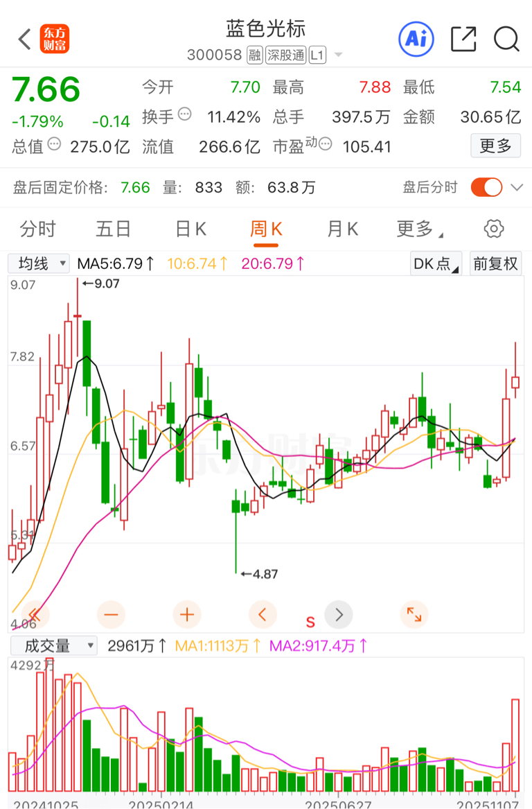 $蓝色光标(SZ300058)$ 底部放量不涨,然后拼命发利好明白什么了吧?40,50亿的量能不是散户能放出来的
