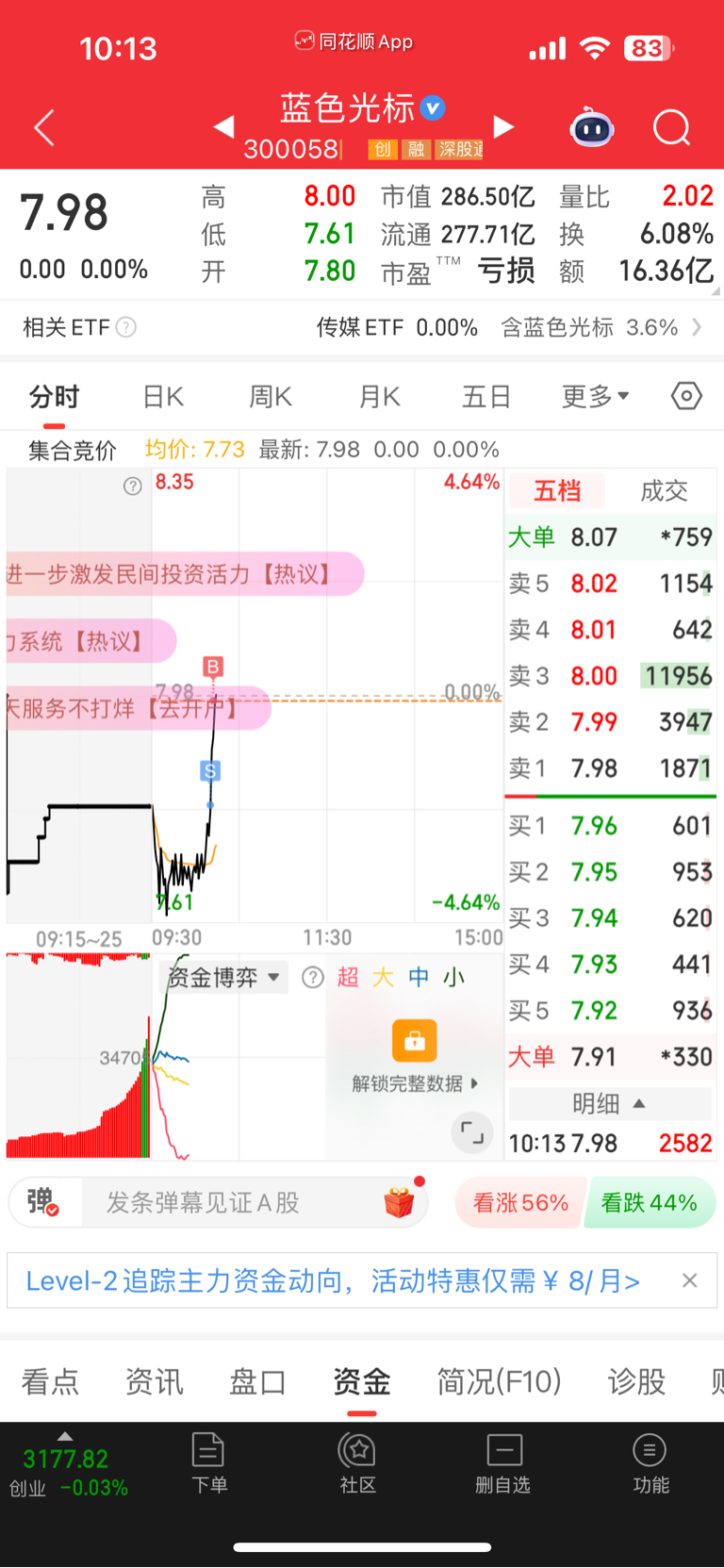 $蓝色光标(SZ300058)$ 我真的无语了,早上挂7.8卖出,忘了撤单了,刚刚又797买回来了,成功作了一个反T,C奥!