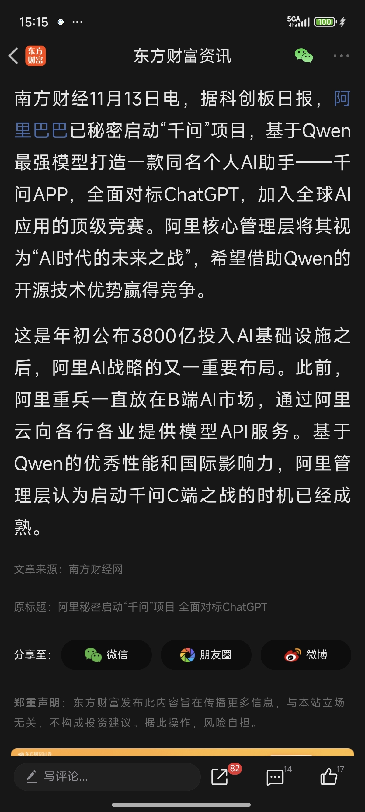 $蓝色光标(SZ300058)$ 上涨的原因给大家找到了 港股阿里巴巴启动千问项目