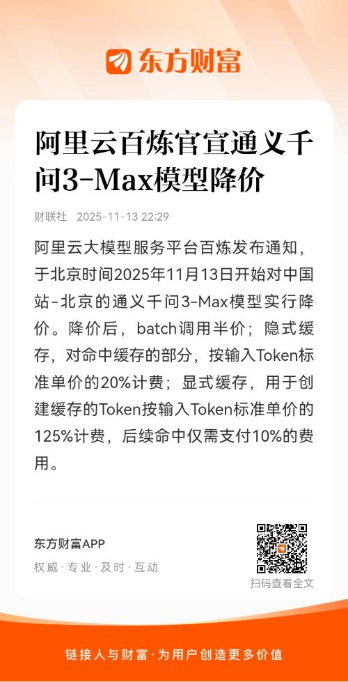 阿里云大模型服务平台百炼发布通知,于北京时间2025年11月13日开始对中国站-北京的通义千问3-Max模型实行降价。降价后,batch调用半价;隐式缓存,对命中缓存的部分,按输入Token标准单价的20%计费;显式缓存,用于创建缓存的Token按输入Token标准单价的125%计费,后续命中仅需支付10%的费用。