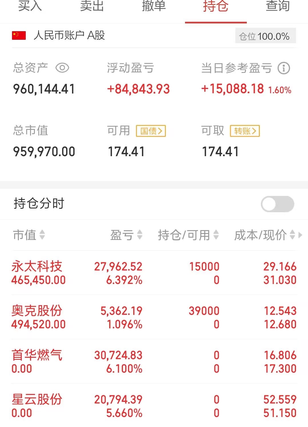首华燃气早盘低开,开盘后直接撤了,坚决也是短线的必胜法诀;星云股份高开拉升盘中也直接撤了;盘中又进场永太科技,上周五回撤,今天高开反转,盘中直接进厂;做买卖千万不追求,买在最低,卖在最高,位置合适即可,过高的要求往往会得不偿失;尾盘进厂奥克股份,今天高开探底回升后尾盘切入;目前个股之间分化,高低切换,节奏比较平顺,也相对稳定