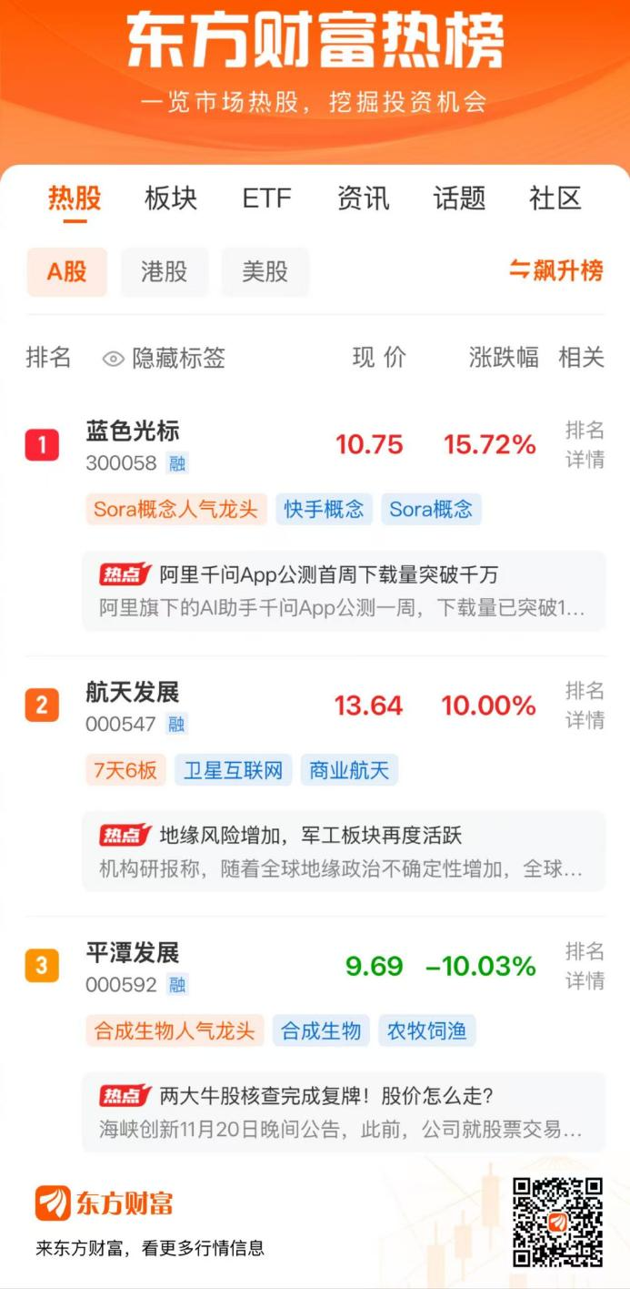 11月24日,两市震荡反弹,三大指数均小幅收涨。东方财富热股榜前三的股票中,蓝色光标位列第1,航天发展位列第2,平潭发展位列第3。