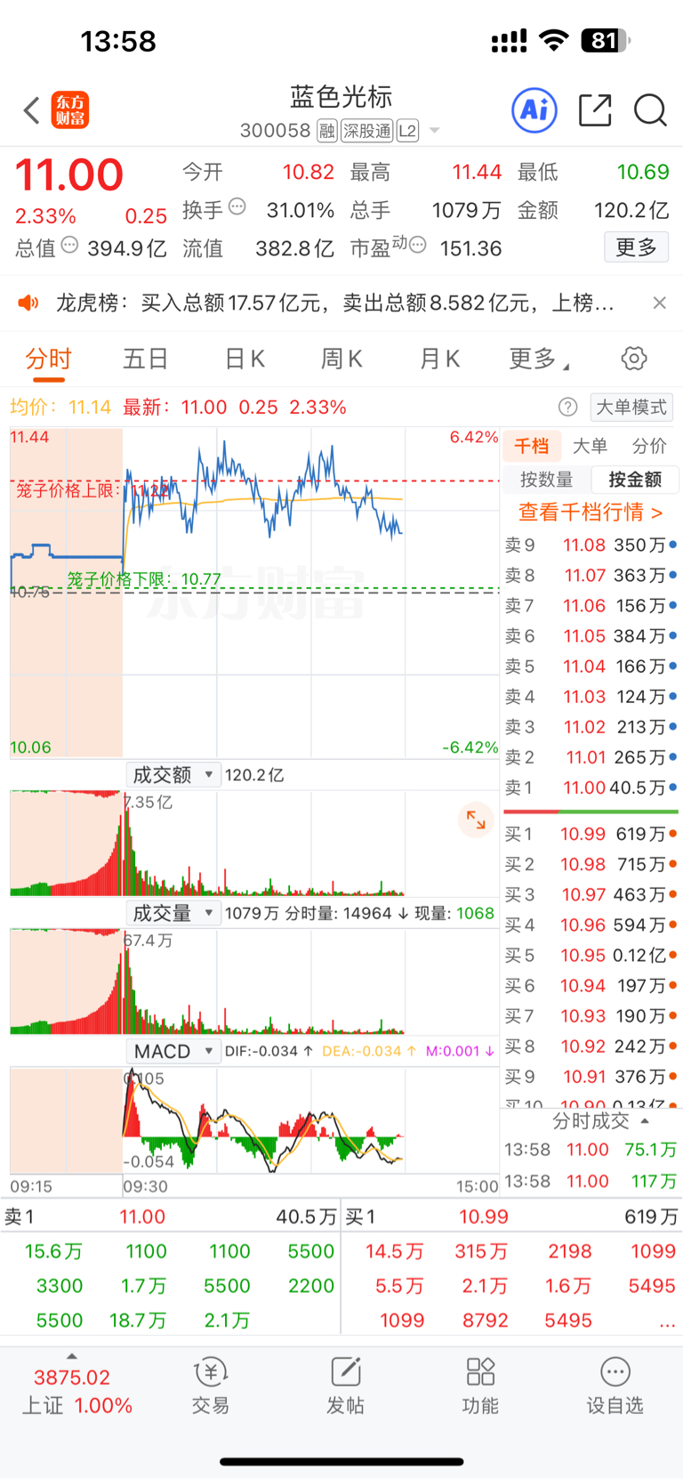 $蓝色光标(SZ300058)$ 我不看空蓝色,但这个对子11.44还是破了再持有比较稳当