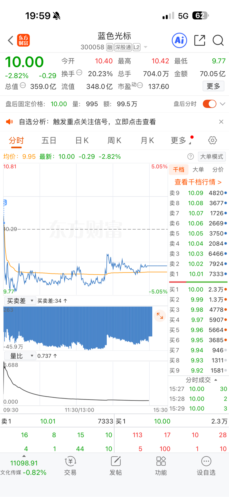 $蓝色光标(SZ300058)$ 昨天10.23买,今天开盘以为拉升,直接砸了,马上10.34卖了