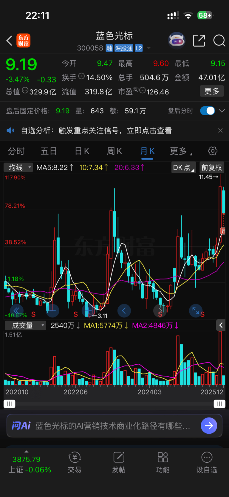 $蓝色光标(SZ300058)$ 这股股性不好。猛涨一两个月,然后猛跌一年