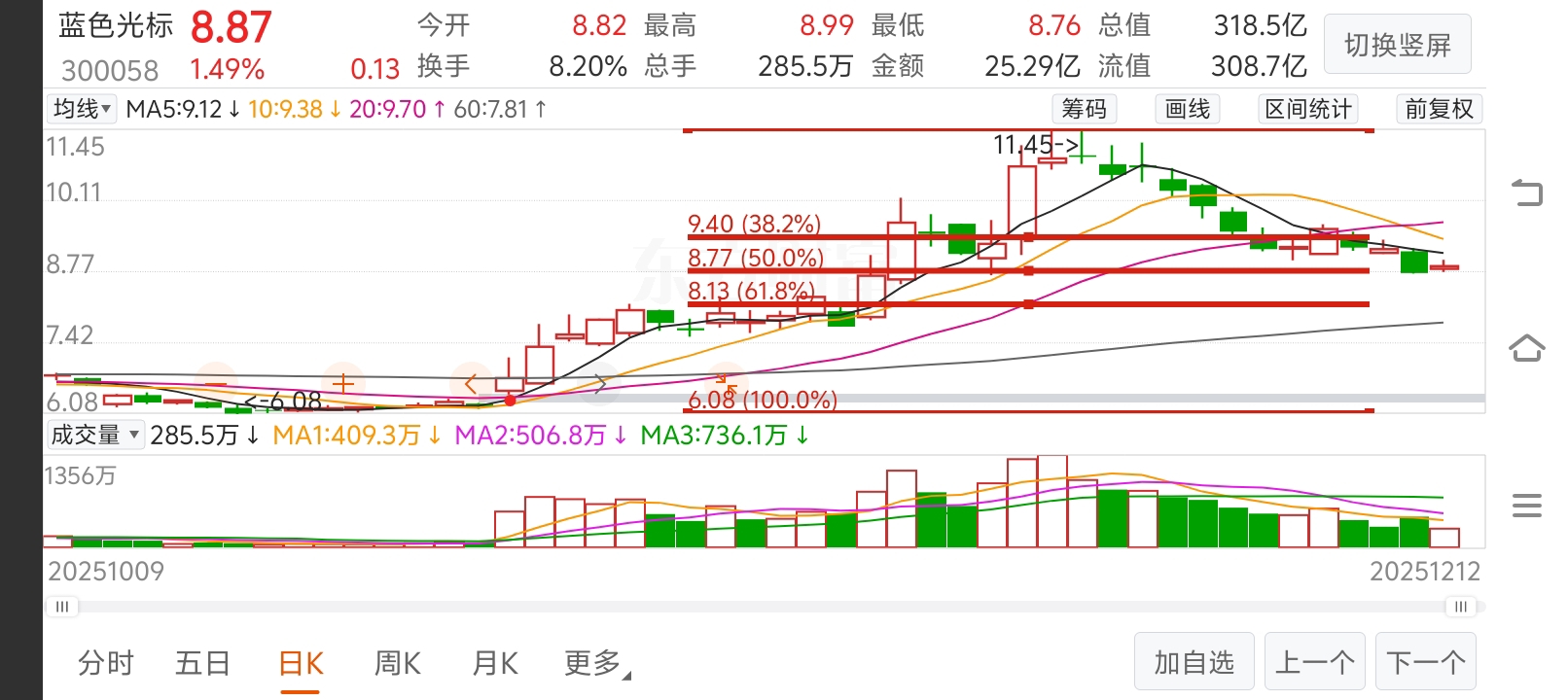 $蓝色光标(SZ300058)$ 单只股票最多两层仓位,分两次买入。如图,黄金分割点,0.5位置和0.618位置,各买入一层。持有此股,不必再买入AI应用其他股票及相关ETF
