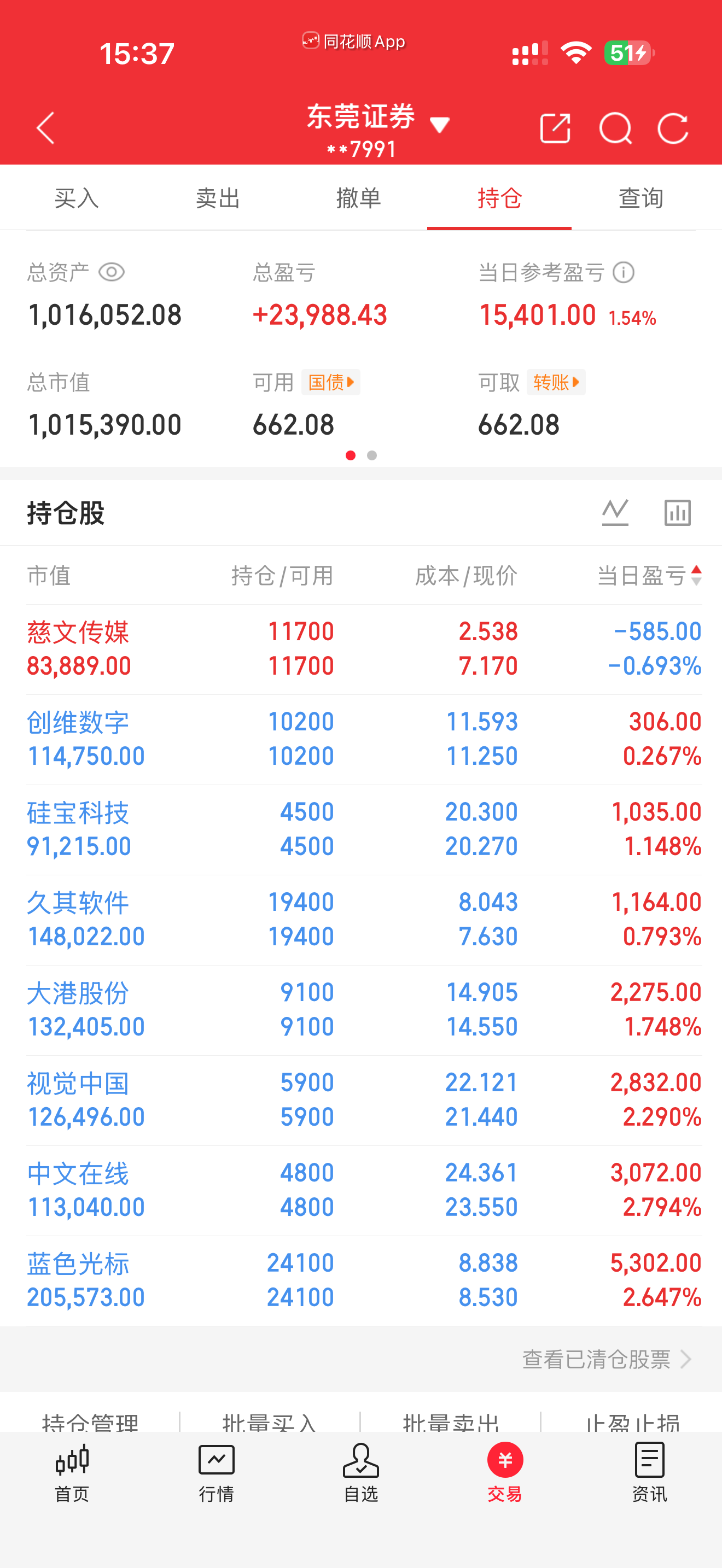 各位前辈今天都大赚了吧,早上抄底又赢麻了,我却在回本的路上。唯一绿的是慈文传媒我觉得朱莉在下一盘大棋。不过没关系。慢慢折腾,合适位置补仓就好了。