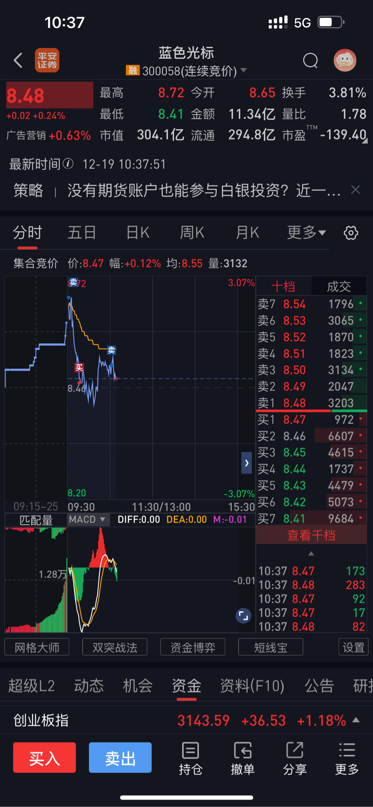 $蓝色光标(SZ300058)$ 早上高开出一大半。平仓接回来。但是感觉实在上不去了。还底舱出去了。上不去就下来再说吧