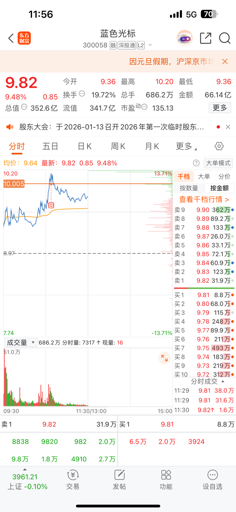 $蓝色光标(SZ300058)$ 买了一手、我是买啥啥跌!