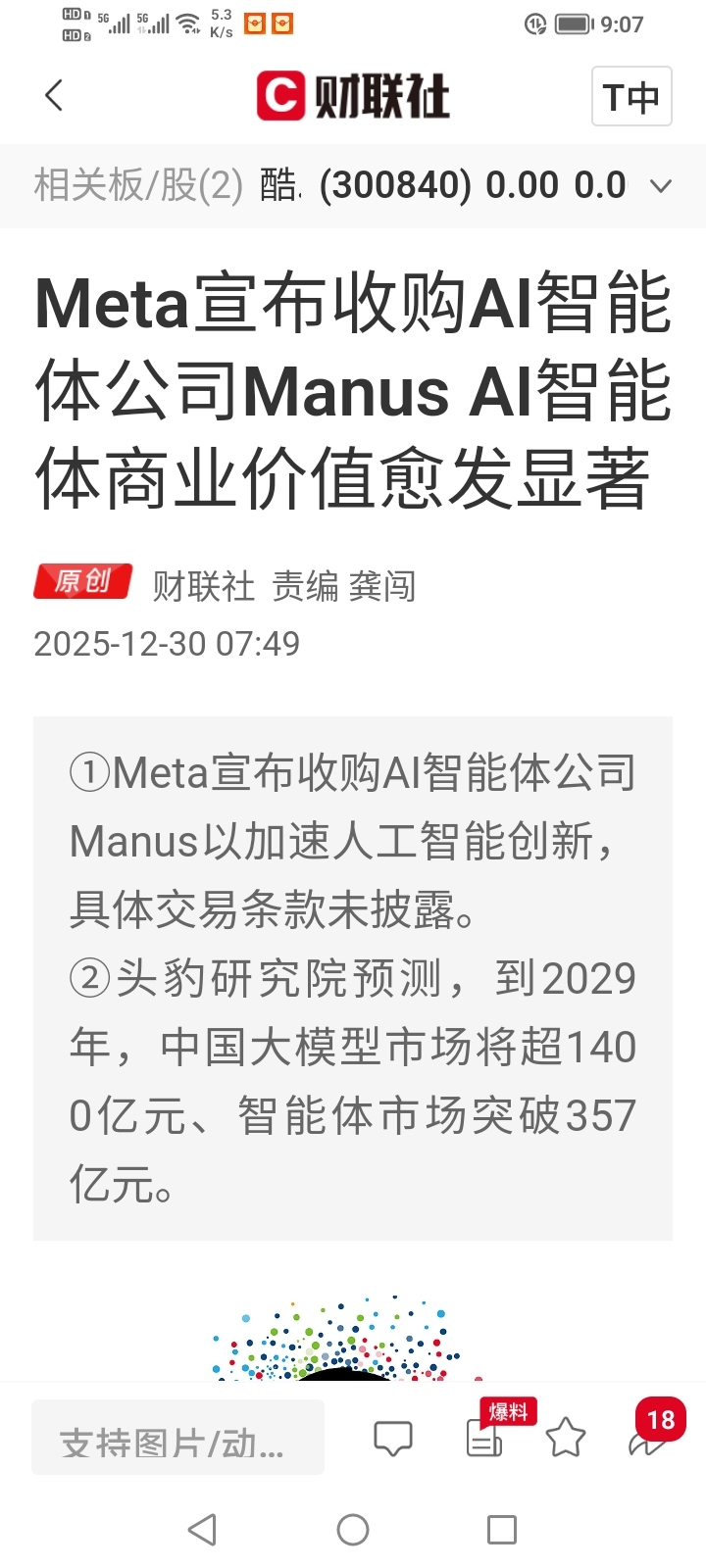 Meta宣布数十亿美元收购AI智能体独角兽Manus,标志AI进入“自主执行”阶段,主线由算力转向应用变现。A股关注三条线:影子映射—蓝色光标、朗科科技、新湖中宝、汤姆猫;平台型中军—三六零、昆仑万维、金山办公、科大讯飞;
