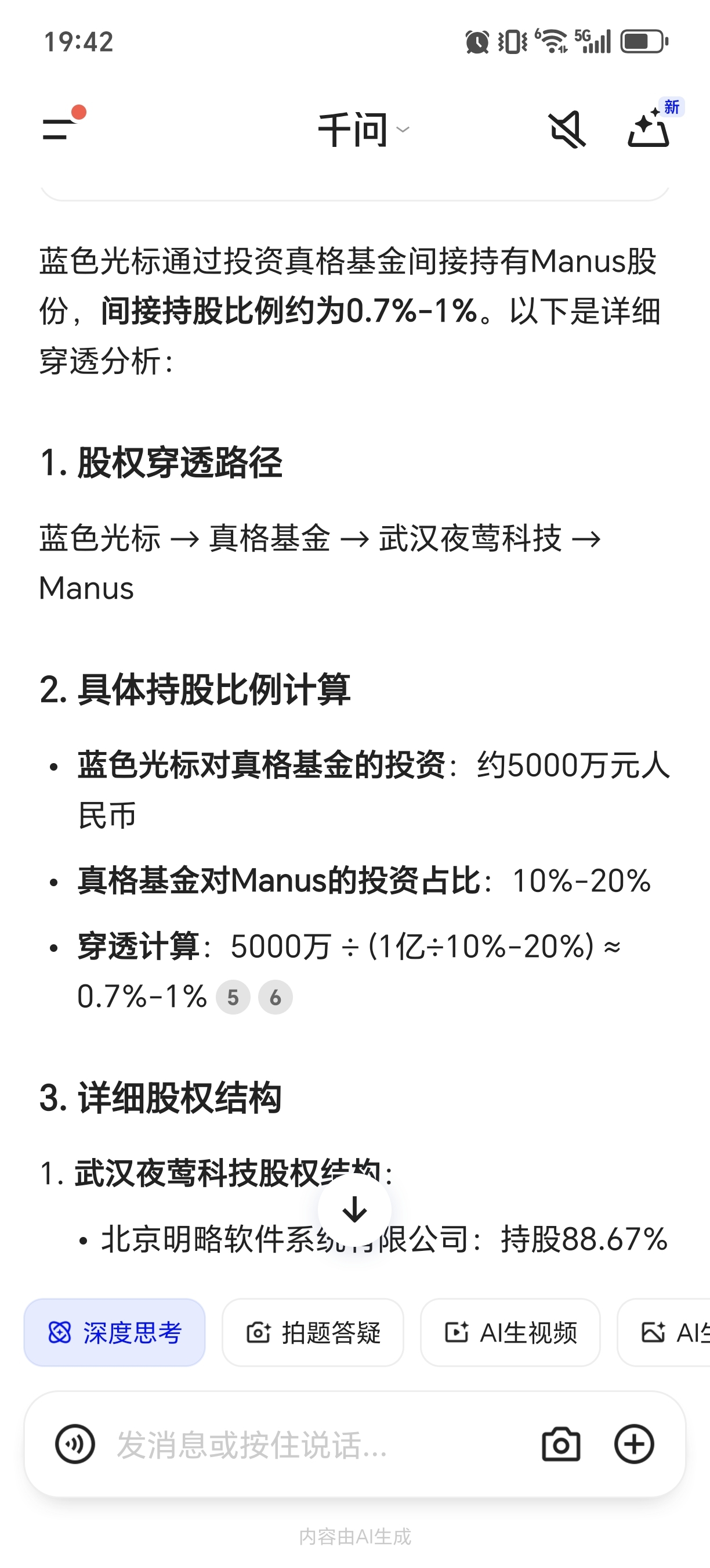 间接持有manus0.7-1%的股份,这次menus被meta数十亿美元收购,大