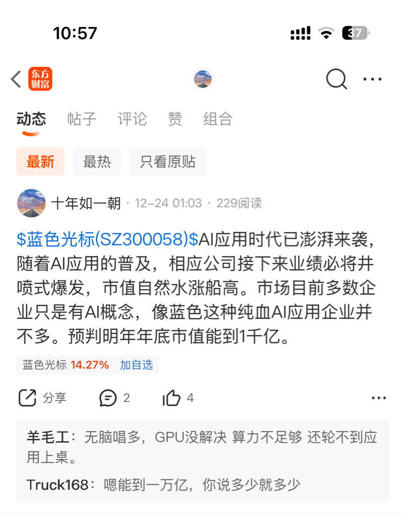 温馨提示: 1.根据《证券法》规定,禁止编造、传播虚假信息或者误导性信息,扰乱证券市场;2.用户在本社区发表的所有资料、言论等仅代表个人观点,与本网站立场无关,不对您构成任何投资建议。用户应基于自己的独立判断,自行决定证券投资并承担相应风险。《东方财富社区管理规定》