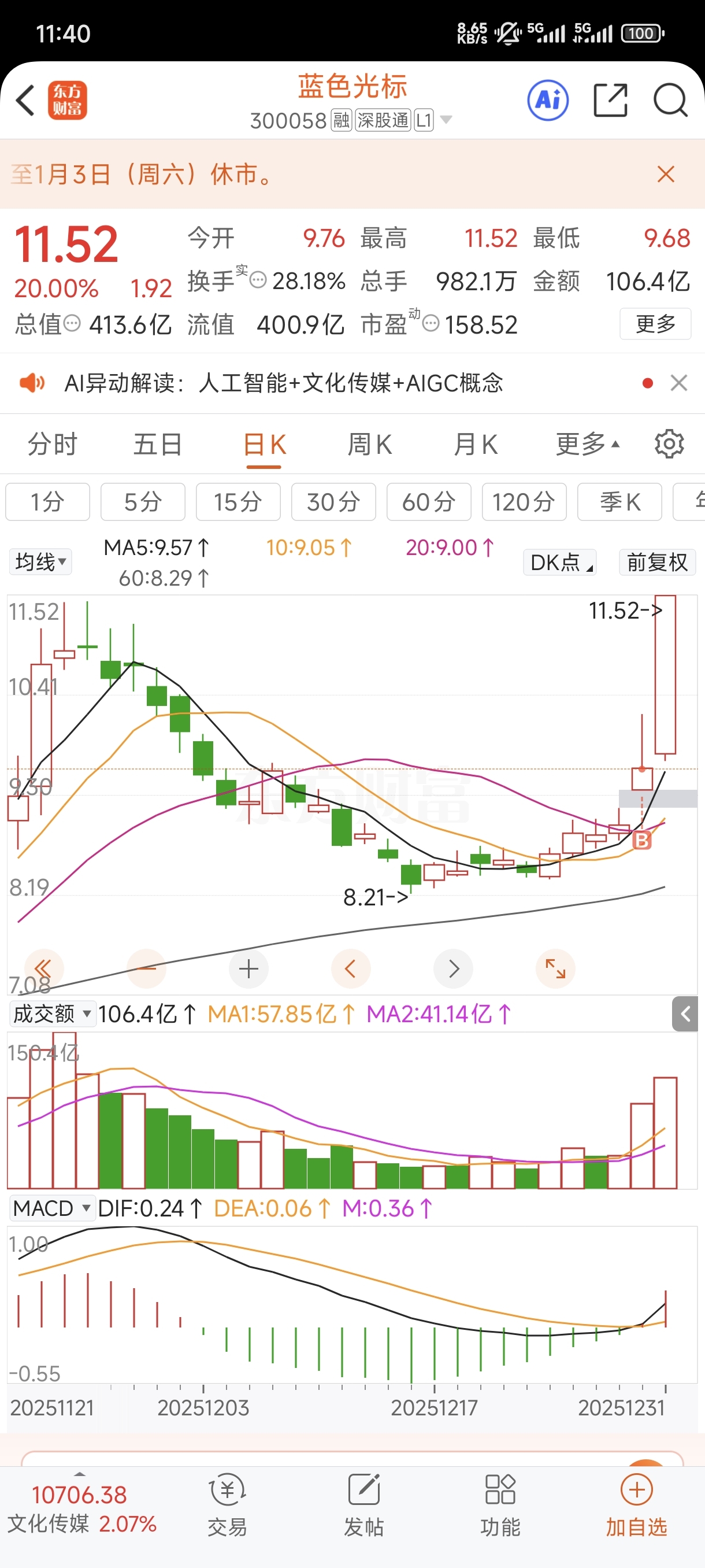 $蓝色光标(SZ300058)$ 昨天尾盘买了一点,没想到居然得到意外惊喜。