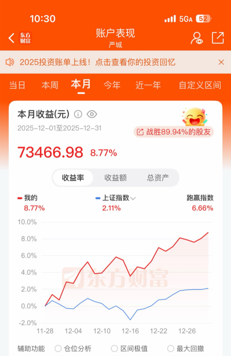 $蓝色光标(SZ300058)$ 感谢主力,不枉我近一个月的连续加仓。不禁感慨一下,轰轰烈烈的2025年终于收官了。看了一下12月份收益,虽在北证有几笔糟糕操作,总体收益尚能接受。愿各位朋友2026平安康乐,财源广进!