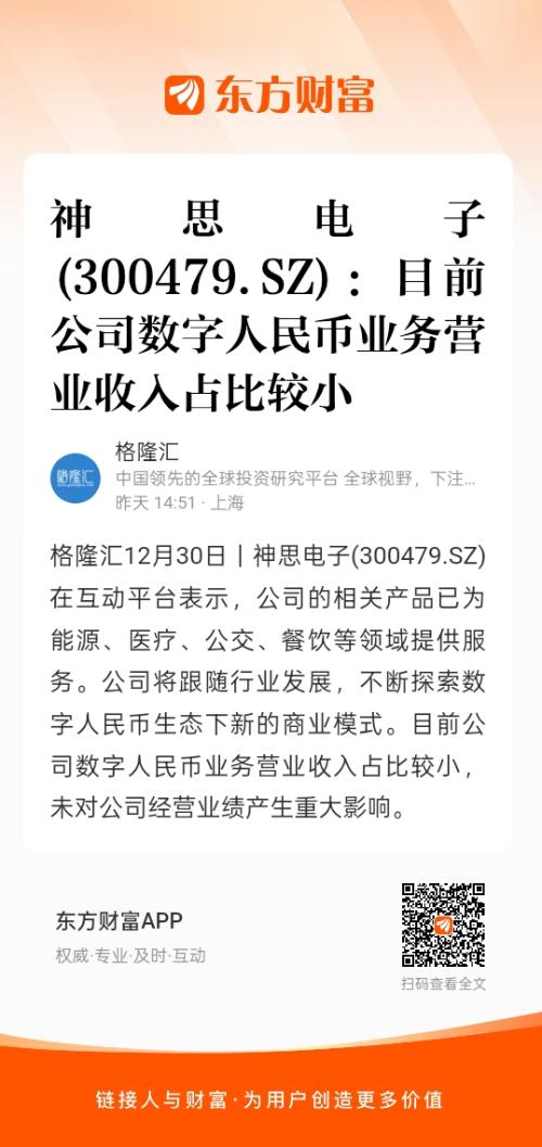 格隆汇12月30日丨神思电子(300479.SZ)在互动平台表示,公司的相关产品已为能源、医疗、公交、餐饮等领域提供服务。公司将跟随行业发展,不断探索数字人民币生态下新的商业模式。目前公司数字人民币业务营业收入占比较小,未对公司经营业绩产生重大影响。