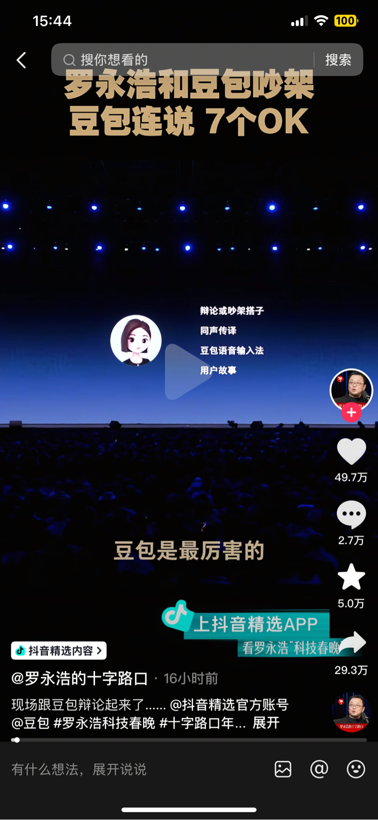 $蓝色光标(SZ300058)$ 罗永浩跟豆包对话,豆包概念股,豆包今年进春晚,感觉这思维能力比机器人跳舞更伟大