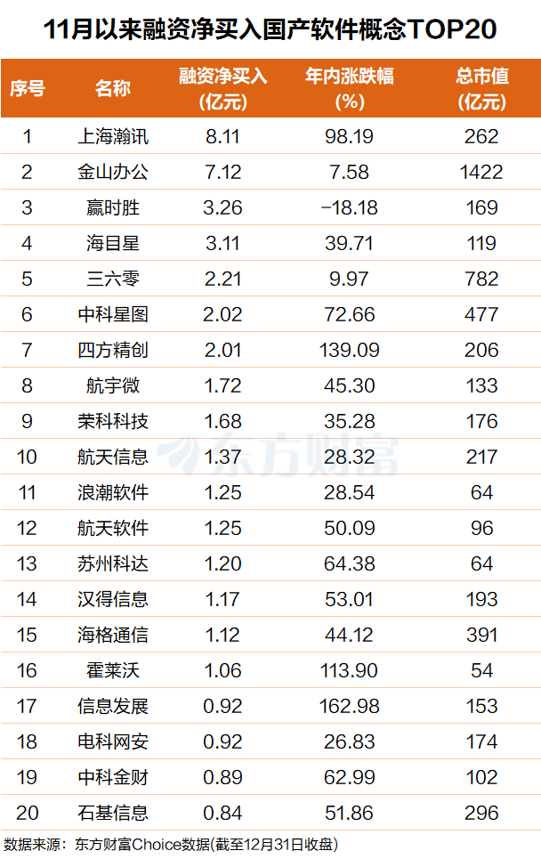 东方财富Choice数据显示,11月以来,杠杆资金净买入多只国产软件概念,融资净买额前20个股合计超43亿元。