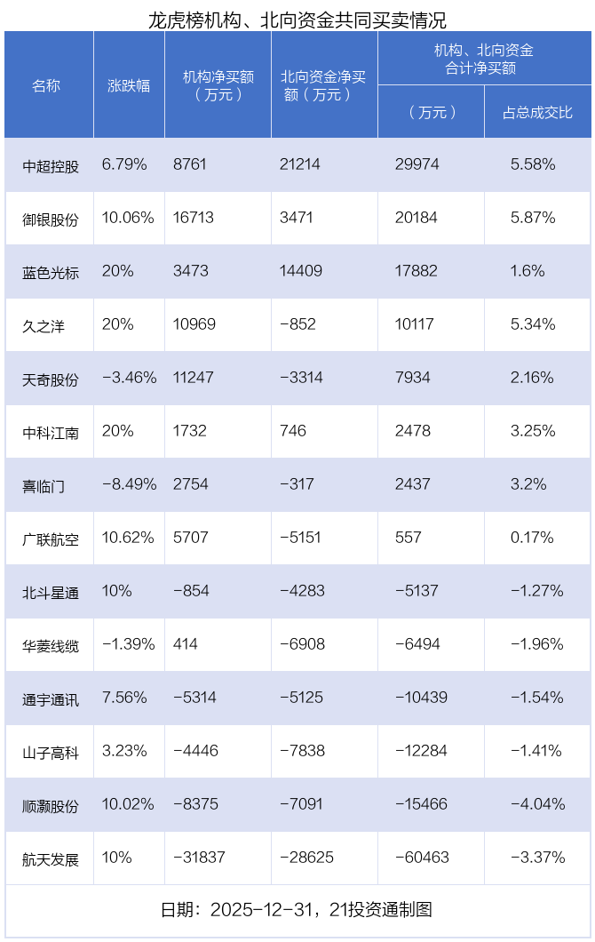 值得注意的是,机构和北向资金共同净买入了中超控股、蓝色光标、御银股份、中科江南等4股;共同净卖出了北斗星通、通宇通讯、顺灏股份、山子高科、航天发展等5股;在喜临门,久之洋,天奇股份,广联航空,华菱线缆上出现分歧,机构净买入喜临门2754.07万元,北向资金净卖出316.9万元;机构净买入久之洋1.1亿元,北向资金净卖出851.82万元;机构净买入天奇股份1.12亿元,北向资金净卖出3313.53万元;机构净买入广联航空5707.44万元,北向资金净卖出5150.79万元;机构净买入华菱线缆413.81万元,北向资金净卖出6908万元。