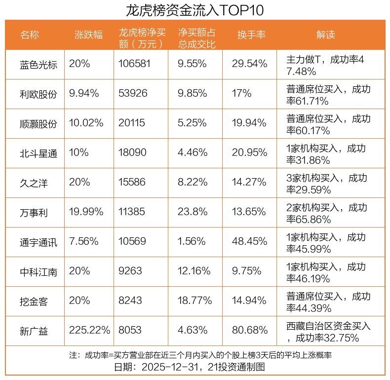 12月31日,上证指数上涨0.09%,深证成指下跌0.58%,创业板指下跌1.23%。盘后龙虎榜数据显示,共有49只个股因当日异动登上龙虎榜,资金净流入最多的是蓝色光标(300058.SZ),达10.66亿元。