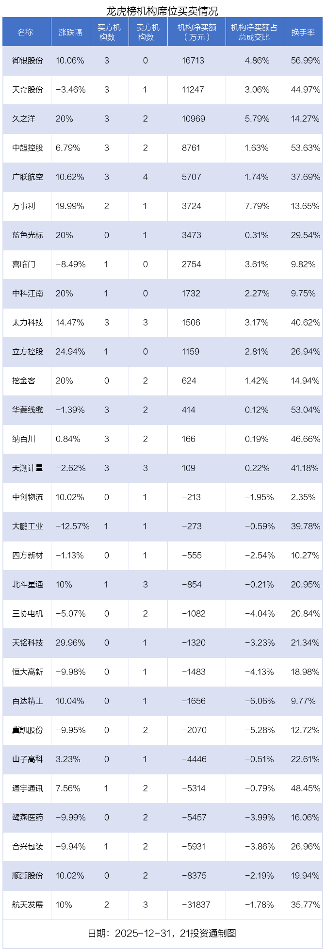 12月31日,30只个股龙虎榜出现了机构的身影,机构合计净卖出1809.32万元。具体来看,机构净买入15股,净卖出15股。