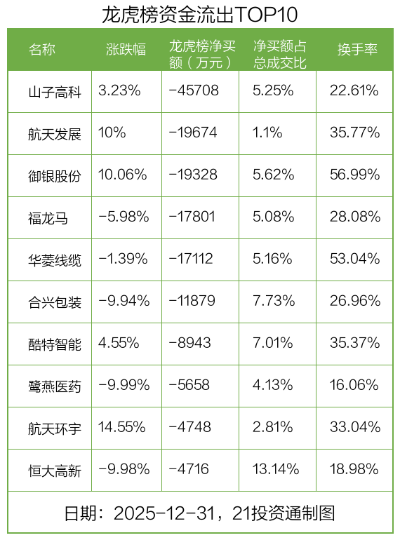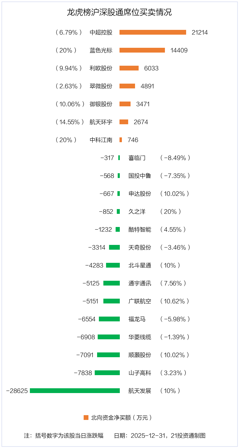 12月31日,北向资金参与龙虎榜中的个股共有21只,合计净卖出2.51亿元。其中沪股通净买入2 股,净卖出4 股,合计净卖出540.42万元;深股通净买入5 股,净卖出10 股,合计净卖出2.45亿元。