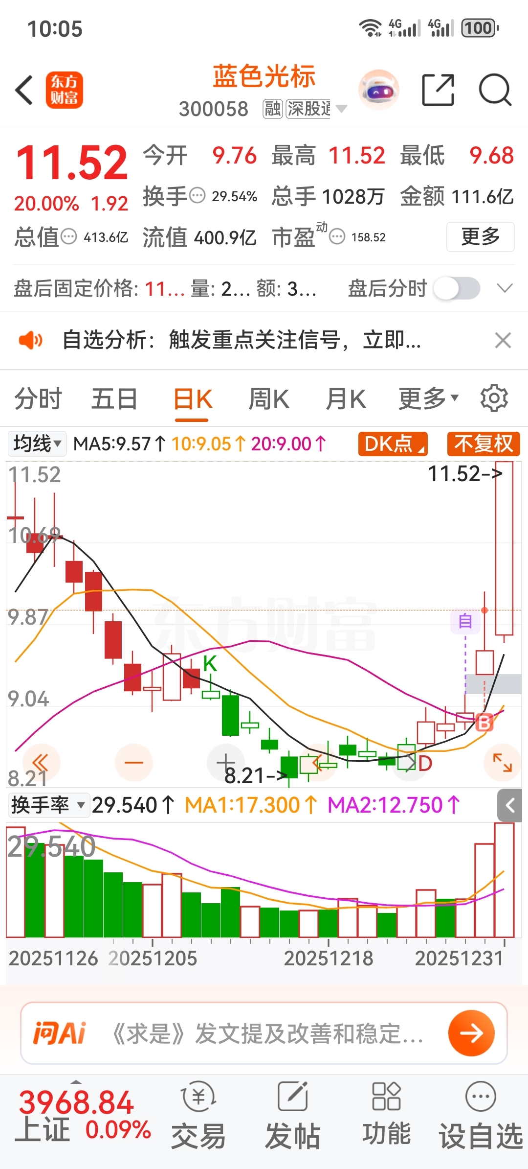 第一天加入自选,第二天开涨果断追高被套在山顶亏6个点。第三天涨停,第四天跑还是不