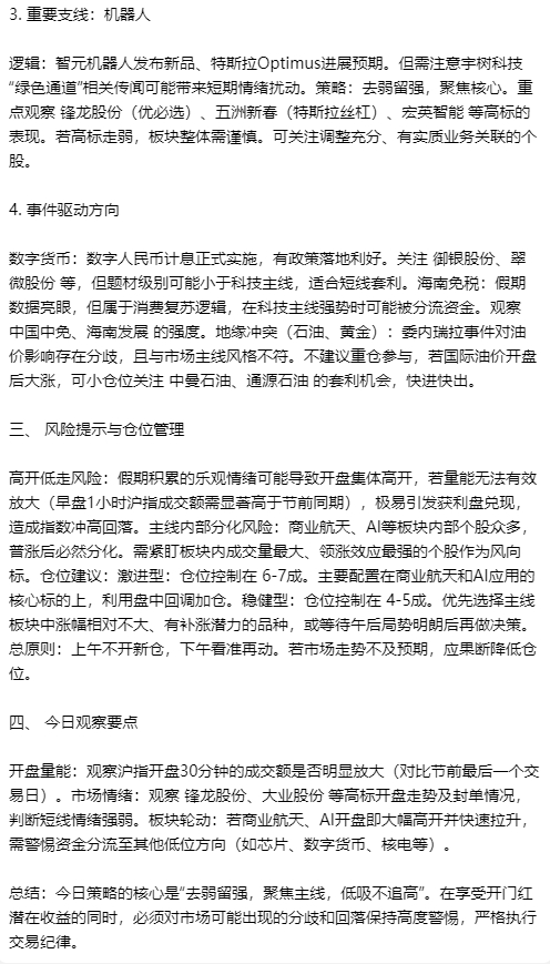 开门红预期强烈,但需警惕高开低走。 假期港股及中概股大涨,尤其是商业航天、芯片等板块表现强势,为A股营造了良好的开盘氛围。然而,A股自身处于关键位置,且假期消息繁杂,市场情绪可能过于一致。核心策略是:拥抱主线,但绝不追高,利用盘中分歧寻找低吸机会,严格控制仓位。