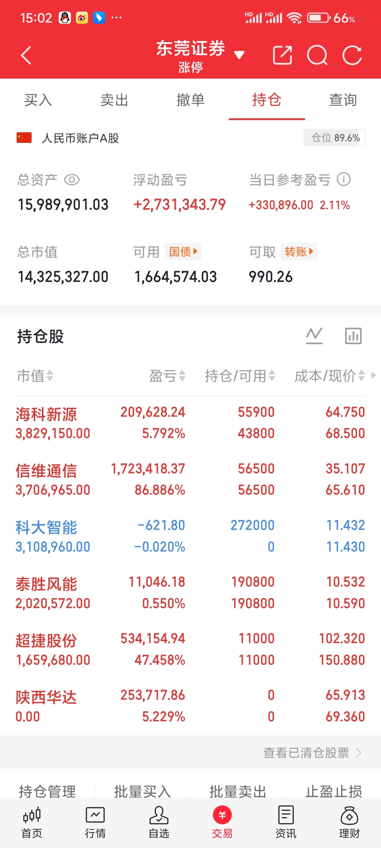 目前持有:海科新源 信维通信 科大智能 泰胜风能 超捷股份。