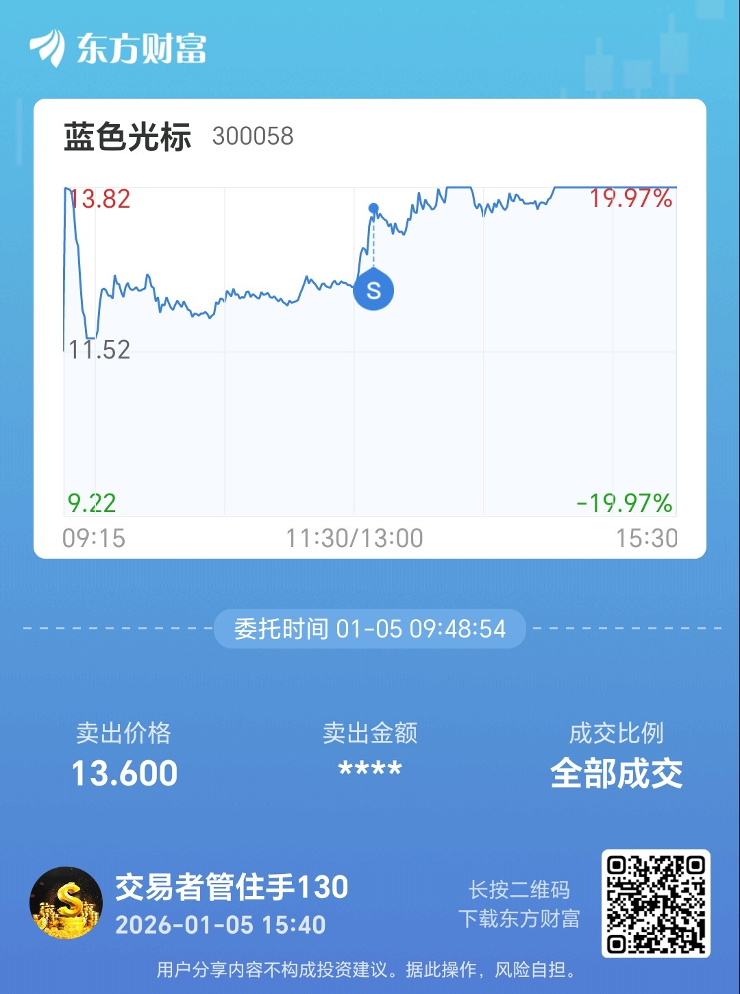温馨提示: 1.根据《证券法》规定,禁止编造、传播虚假信息或者误导性信息,扰乱证券市场;2.用户在本社区发表的所有资料、言论等仅代表个人观点,与本网站立场无关,不对您构成任何投资建议。用户应基于自己的独立判断,自行决定证券投资并承担相应风险。《东方财富社区管理规定》